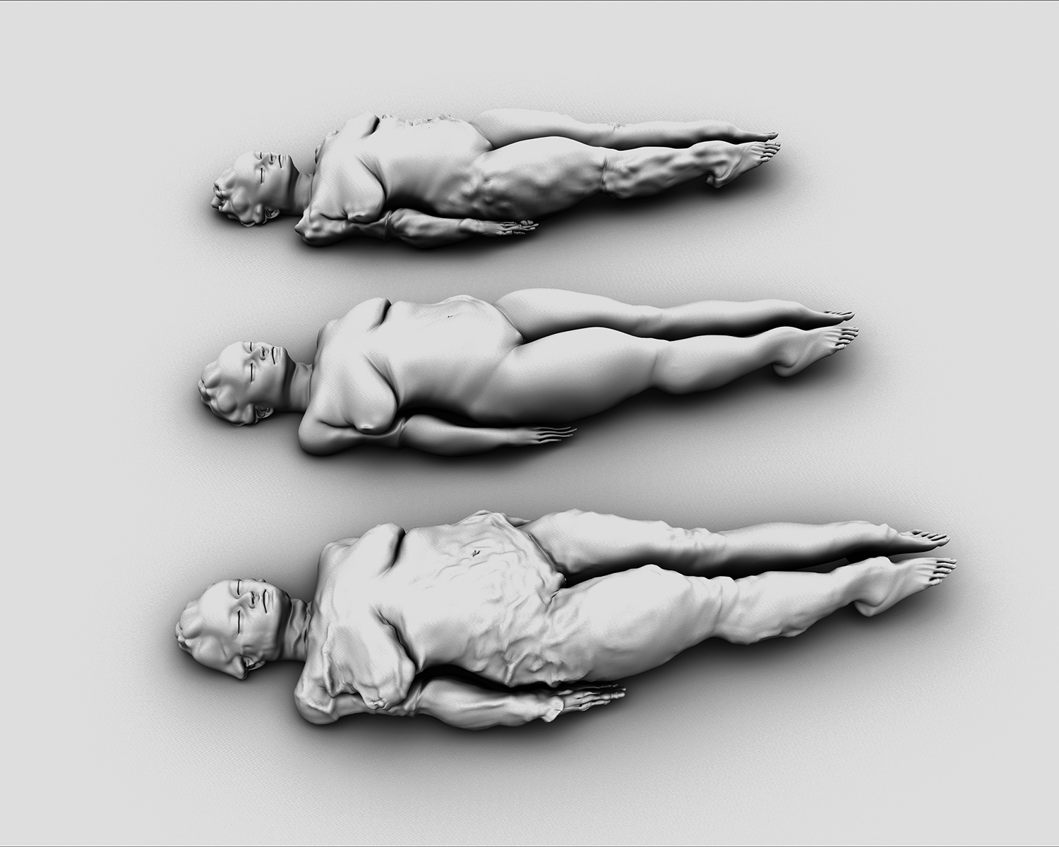 This body of work, shown at the Friedhofsmuseum for the first time, is a group of virtual sculptures that I call the Mortifications. To create them, I’ve built a series of models using 3D software evoking classical sculptures. Although these works may seem to be images, I actually think of them as a new form of sculpture, merging photography with a 3-dimensional virtual model that exists only inside of a computer. After I build the models, I fake the process of aging by using another software typically used in the computer-game industry to create skin for zombies and all varieties of different monsters.