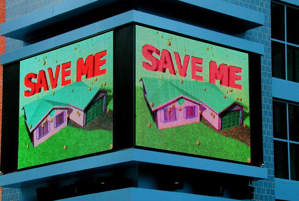 "Save Me" ambivalently promotes ironic redemption as the solution to suburban American angst. Beginning as a 3D animated gallery work, the campaign has moved across several media platforms: the Speed Museum sponsored billboards around Louisville, and the Wood Street Gallery sponsored an animated LED neon display in downtown Pittsburgh.