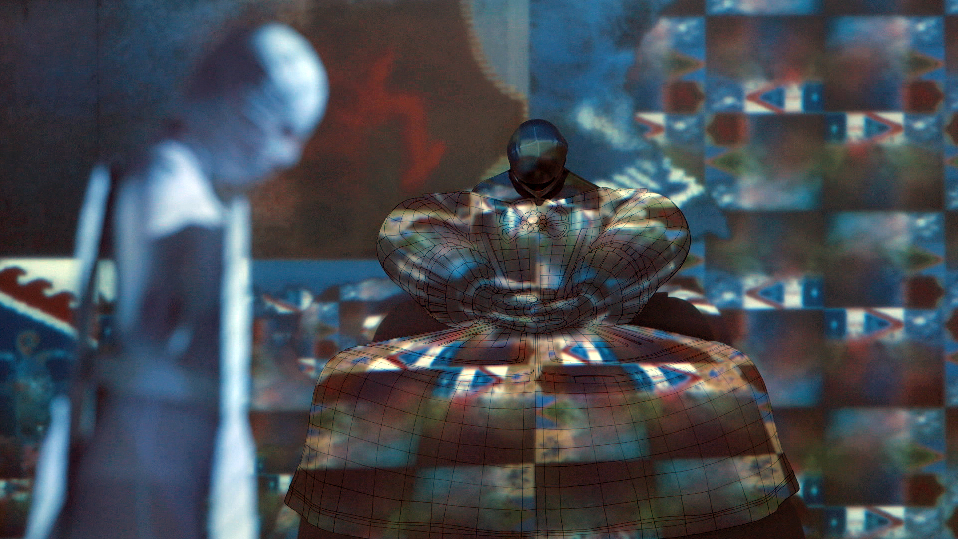 The algorithmic flickering patterns used in The Dolls were made from specially designed graphics based on the symbols of further collapsed empires - from the Faberge eggs of The House of Romanov to the banners and heraldry of Gengis Kahn and the Mongol Empire. Distributed among these are also the current logos and graphical icons of our own multinationals corporations. The end result of all of these flickering signs is in some ways like a stroll through Times Square or a glitzy night in Vegas. But it is also paradoxically and strangely quite trance inducing and meditative. This is because The Dolls is truly heartfelt. The work is intended by its author to induce contemplation on the passage of time and the death of kings, and meant to be a vehicle for some kind of enlightenment.