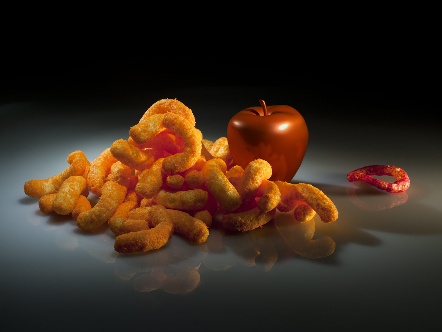 These photos are my response to surreal trips down the aisles of the "jewel." The Real and The Fake photos are classical still lives of nutritionally-empty industrial snack-foods that nevertheless have appealing Platonic forms. They are integrated with obviously simulated computer graphics of apples (I actually stole the series' title from an exhibition about computer graphics curated by Rachel Clarke and myself, see www.real-fake.org).